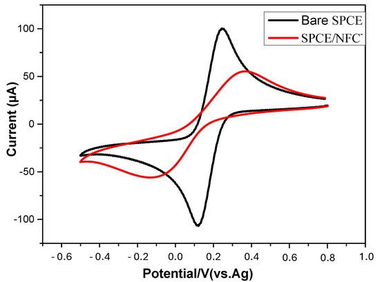 Cyclic voltammetry was performed to investigate the electrode’s behavior after the deposition of the TOCNF film on the SPCE surface. Figure 3 illustrates the change in electroactivity of the [Fe(CN)6]3−/4− redox probe on both the bare and TOCNF-modified SPCEs. The cyclic voltammogram displays a quasi-reversible redox peak, with a ΔEp of 100 mV and a current ratio of approximately 1:1 (Ia = 100 µA; Ic = 108 µA) between the anodic and cathodic peaks, indicating that the SPCE undergoes an interfacial reaction with the [Fe(CN)6]3−/4− couple. Following the deposition of the TOCNFs, ΔEp is equal to 490 mV, and the peak currents decrease (Ia = 56 µA; Ic = 58 µA). The redox system becomes irreversible; this is due to the poor conductivity of the TOCNFs and their negative charge, which pushes back the negatively charged redox system. This result confirms the stability of the TOCNF film on the SPCE surface during the electrochemical measurements.