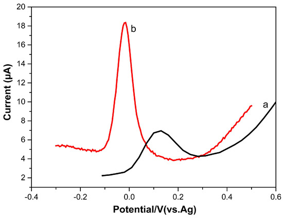 The electrochemical performance of 10 µM dopamine on the bare SPCE (a) and on the TOCNF-modified SPCE (b) was investigated by DPV in PBS (pH 7.0) (Figure 4). The oxidation peak potential was found to be 0.11 V for dopamine at the bare SPCE and 0.03 V at the TOCNF-modified SPCE. Additionally, the intensity increased by a factor of 4.9 following the modification of the SPCE. This intensity amplification is attributed to the enhanced adsorption of dopamine molecules on the TOCNF film at pH 7. This irreversible phenomenon was observed with the inner sphere cationic dopamine on sulfated CNFs [30], which shows that dopamine molecules have specific chemical interactions with the negatively charged CNF surface; besides electrostatic interactions, hydrogen bonds can be formed between the hydroxyl groups of dopamine and TOCNFs.