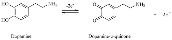 where Ipa represents the anodic peak current, n is the number of electrons transferred, Q is the amount of charge integrated from the area of voltammetric peak, F is the Faraday constant (96500 C/mol), T is the temperature in Kelvin (298 K), and R is the universal gas constant (8.314 J.mol−1) [33]. From the linear relationship between Ip and the scan rate (v), the value of n was calculated to be 2. It follows that the oxidation of dopamine involves the transfer of two electrons and two protons. Taking into account both the experimental results and the existing literature, the proposed mechanism for dopamine oxidation on the TOCNF-modified SPCE is illustrated in Figure 8.