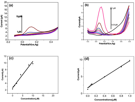 DPV detection of dopamine in a concentration range from 1 to 10 µM on the bare SPCE (a) and from 0.01 µM to 1 µM on the TOCNF-modified SPCE (red 0.01 µM, blue 0.04 µM, green 0.06 µM, pink 0.08 µM, khaki 0.1 µM, black 0.4 µM, brown 0.8 µM, pink 1 µM) (0.01 M phosphate-buffered solution (pH 7.0)) (b) in 0.01 M phosphate-buffered solution (pH 7.0); scan rate 50 mV/s. Calibration curve of dopamine at the bare SPCE (c) and at the TOCNF-modified SPCE (0.01 M phosphate-buffered solution (pH 7.0)) (d). Experimental conditions: 0.01 M phosphate-buffered solution (pH 7.0), scan rate 50 mV/s.