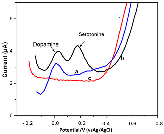 The electrochemical response of 0.5 µM dopamine was tested in the presence of 0.5 µM serotonin (Figure 11). The separation of both peaks was 160 mV, which is equal to that obtained with synthetic nanomaterials such as perovskites [39].