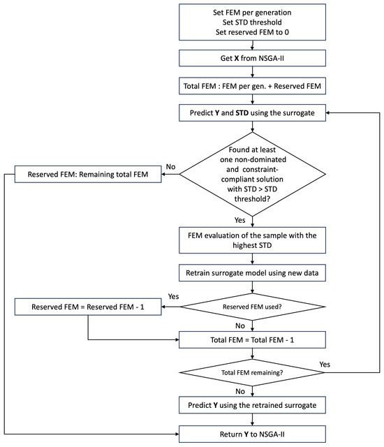 Once a solution undergoes FEM evaluation, the resulting objectives are used to update and refine the surrogate model. When multiple evaluations are planned within a generation, each sample is evaluated one at a time, and after each FEM simulation, the surrogate model is updated accordingly. This sequential method is deliberate and particularly effective in early generations when model uncertainties are higher, as each evaluation can significantly adjust the predictions; while this approach does increase the frequency of surrogate model training and prediction steps, these operations are computationally inexpensive compared to FEM simulations. Thus, the additional computational overhead is minimal or even negligible. After all evaluations are completed, the updated predictions are used to guide NSGA-II in ranking and selection of individuals that proceed to the next generation.