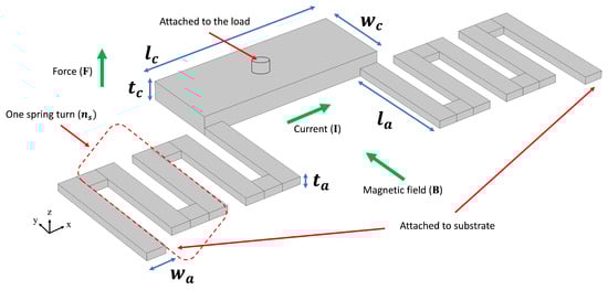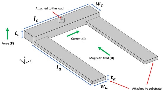 The first MEMS device considered for optimization is a U-shaped Lorentz force actuator [44], as depicted in Figure 2. When exposed to an external magnetic field, a current passing through the crossbar generates a Lorentz force, causing the crossbar, and hence the load, to move vertically. Mathematically, the generated force is calculated using the equation