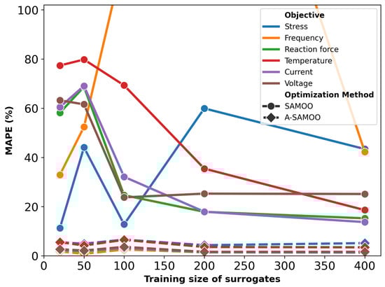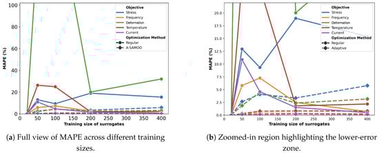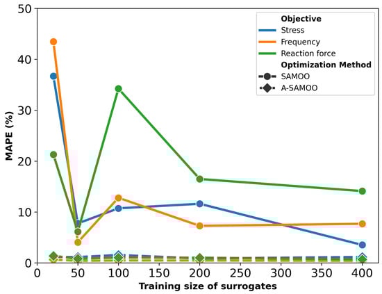 The MAPE values after optimization are provided in Figure 16. With a training size of 20 samples, the optimizer fails to produce any optimal designs, making MAPE reporting irrelevant—an issue not previously encountered, even with adaptive optimization. This can be attributed strict objective constraints. For instance, the average stress value of initial samples was 2.82 × 109 Pa, nearly 10 times that of the constraint. For deformation, the average was 5.29 μm, only slightly better than the constraint, 5 μm.