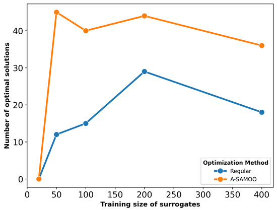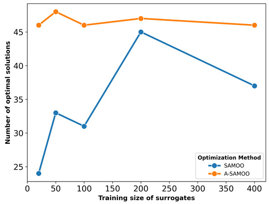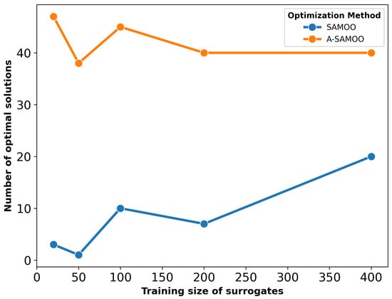 Figure 17 shows the number of optimal solutions versus training sizes for surrogates used in optimization. The results reaffirm that online training in the A-SAMOO approach enables the NSGA-II optimizer to find more optimal solutions compared to offline training.