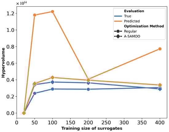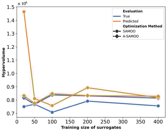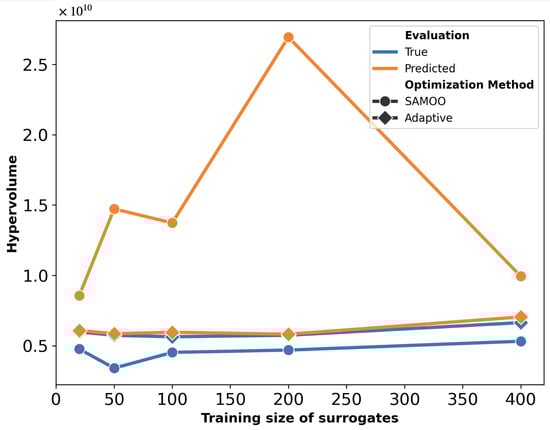 Figure 18 further supports the advantages of A-SAMOO through hypervolume analysis. Most training sizes show a large discrepancy between actual and predicted hypervolume values for SAMOO, suggesting that offline-trained surrogates tend to overestimate solution quality. An anomaly occurs at a training size of 400, where the actual hypervolume for regular optimization slightly surpasses that of the adaptive approach. This difference is minor and does not undermine A-SAMOO’s overall benefits. It likely arises from inherent surrogate inaccuracies, which can occasionally lead to favorable outcomes.