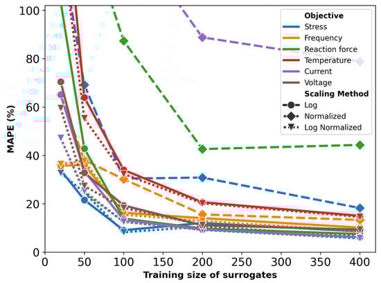 Figure 14 illustrates the MAPE for surrogate models trained with varying dataset sizes for the thermal actuator. The choice of scaling method significantly influences the predictive accuracy of the surrogate models. Error values corresponding to log scaling and normalization are generally larger than 100% and therefore do not fit in the plot. Similar to previous cases, the combination of log scaling and normalization consistently provides the most accurate predictions.
