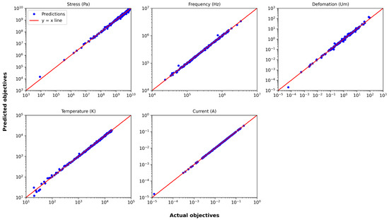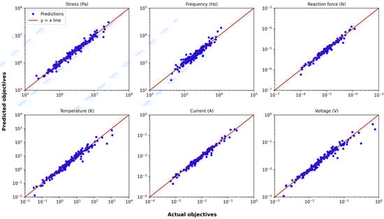 In contrast to previous actuators, the thermal actuator does not benefit as much from log scaling alone. This difference is likely attributable to the considerably broader range of objectives associated with the thermal actuator, where most objectives span at least three orders of magnitude, excluding the resonant frequency; while the specific reasons for the heightened impact of normalization remain unclear, it is evident that the wide range of values plays a critical role in shaping the predictive performance. As an example, actual vs. predicted plots of objectives for surrogates with the training size of 200 are provided in Figure 15, demonstrating accurate predictions, particularly for current.