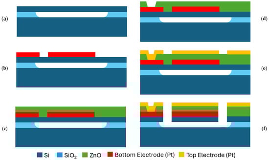 Step-by-step fabrication process of piezoelectric ZnO-on-SOI MEMS resonators: (a) resonator pre-release; (b) bottom electrode deposition and patterned by lift-off; (c) sputtering deposition of the piezoelectric ZnO film; (d) etch vias through ZnO for the bottom electrodes access; (e) deposition and patterning of top electrodes; and (f) ZnO dry etch followed by silicon dry etch.