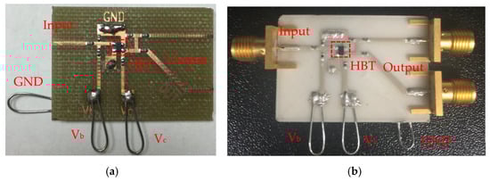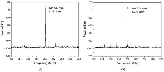 Comparison of the output amplitude measured for two 260 MHz oscillator design implementations: (a) PCB board with an HBT transistor with an output power of 5.152 dBm and (b) 3D-printed assembly with an HBT transistor with an output power of 4.575 dBm.