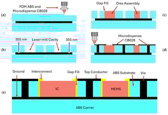 A conceptual illustration of the 3D-printing process used to implement a MEMS resonator-based Pierce oscillator in the form of system-in-package, including key steps: (a) the 3D-printing of the ABS substrate layer by fused deposition modeling (FDM), followed by microdispensing of CB028 ink (a silver paste)-based RF ground plane that is then covered by a FDM 3D-printed ABS layer with the thickness matching that of the MEMS and IC chips; (b) the laser milling of the cavity for embedding the MEMS/IC chips and needed via holes; (c) the insertion of the MEMS and IC dies into the designated cavities by the pick-and-place function; (d) the microdispensing interconnects and via hole refilling with the CB028 ink; and (e) the final structure of the assembled MEMS resonator-based Pierce oscillator.