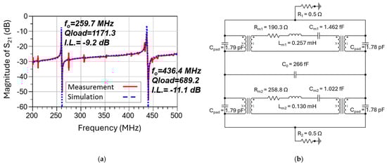 (a) A comparison between measured frequency responses (S21 in dB) and simulated results based on a full dual-mode equivalent circuit model of the ZnO-on-SOI resonator at 259.7 MHz and 436.4 MHz; and (b) the implemented electrical equivalent circuit model for dual-mode resonances of the ZnO-on-SOI resonator, which is employed to obtain a simulated frequency response (S21 in dB).