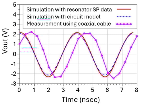 For the purpose of successfully generating two stable oscillation output signals, it is also crucial to evaluate the discrepancies between the measured and simulated oscillator output waveforms. It is worthwhile mentioning that the full time-domain oscillator simulation included all the behavior models for the lumped components, such as the transistor under its chosen bias conditions, and the substrate property was suitably modified to represent the 3D-printed ABS material. Two different oscillator design approaches were adopted to integrate the resonator tank circuit with the rest of the Pierce oscillator circuit components. As shown in Figure 8, the direct “plug-in” insertion of the resonator’s scattering-parameter (SP) data in simulation works equally as well as the experimentally validated equivalent circuit model of the resonator, as shown in Figure 6.