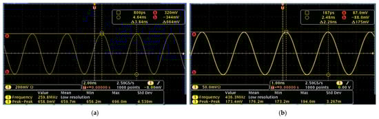 E-pHEMT transistor-based dual-mode Pierce oscillator’s output waveforms measured by an oscilloscope: (a) at 260 MHz with a peak-to-peak voltage of 4.62 V and (b) at 437 MHz with a peak-to-peak voltage of 2.36 V.