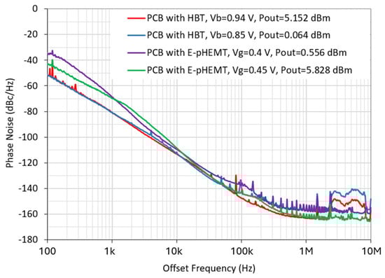 Phase noise comparison of HBT and E-pHEMT-based oscillators implemented by PCB.