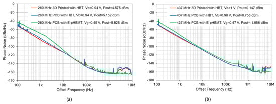 Figure 15 and Figure 16 show the measured phase noise responses of HBT-based Pierce oscillators operating at 260 MHz and 437 MHz, respectively, with oscillator circuits implemented by both traditional PCB technology and 3D-printed ABS chip-carrier. As shown, the Pierce oscillator implemented with an HBT transistor using PCB technology can achieve dual-frequency outputs at 260 MHz and 437 MHz, while producing the output powers of 5.152 dBm (as shown in Figure 15a) and 0.753 dBm (as shown in Figure 16a), respectively. Meanwhile, the oscillator integrated with an HBT transistor over a 3D-printed ABS substrate can be biased to generate oscillation outputs of 4.575 dBm at 260 MHz (as seen in Figure 15b) and 0.147 dBm at 437 MHz (as seen in Figure 16b). For comparison, all MEMS oscillator measurements were performed by employing the same dual-mode MEMS resonator as the tank circuit. It is worthwhile mentioning that the oscillator implemented by an HBT transistor, together with a 3D-printed ABS chip-carrier assembly at both 260 MHz and 437 MHz, showed slightly improved close-to-carrier phase noise performance, which is 2–3 dB lower than that of its PCB counterpart, as seen in Figure 17.