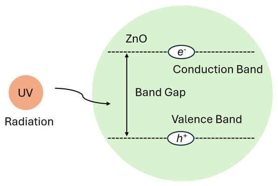 A schematic diagram to illustrate electron-hole transfer between the valence band and conduction band with a ZnO layer as a high bandgap semiconductor material, which can typically be excited by external energy sources such as UV radiation.