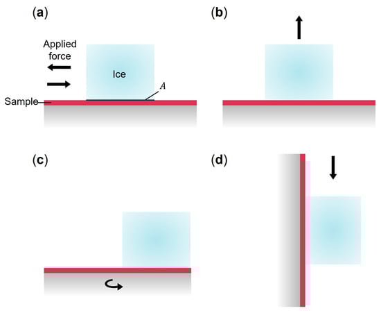 Schematic representation of the four most commonly used test methods for measuring ice adhesion strength: (a) horizontal shear (pull or push test) (where A is the contact area between the ice block and the substrate) [,,,,]; (b) tensile [,]; (c) centrifuge [,]; and (d) vertical shear tests [].