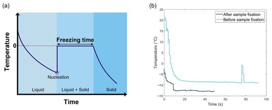 (a) Typical profile of water freezing and (b) evolution of the temperature of a distilled water droplet deposited before and after fixing a copper substrate on a cooling plate.