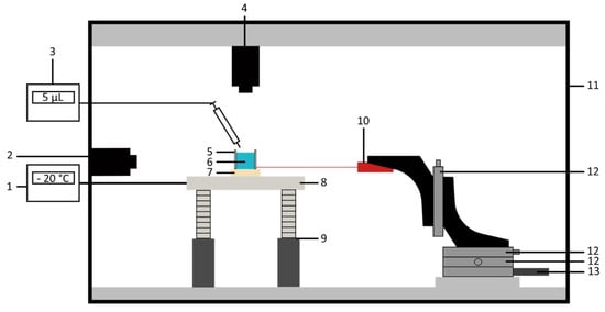 Diagram of the test bench: (1) cryostat, (2) optical camera, (3) syringe pump, (4) IR camera, (5) acrylonitrile butadiene styrene (ABS) mold, (6) ice block, (7) sample, (8) cooling plate, (9) adjustable foot for leveling, (10) force sensor, (11) glove box, (12) micrometer, and (13) motor.