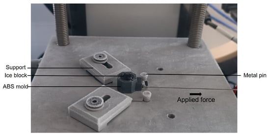 Thus, the development of a reproducible and controlled test bench is essential for fostering progress in this area. This study proposes the implementation of a test bench capable of characterizing the ice adhesion strength and freezing time of surfaces under humidity conditions controlled to mimic real-world environments. In the literature, ice adhesion measurements are often based on static and impact ice [,,,,]. Static ice is formed by freezing water in a mold, while impact ice simulates rain striking a surface, introducing greater complexity and variability in ice area control. Although static ice tests do not replicate real-life ice accumulation, they provide a controlled environment to assess ice adhesion strength, aiding material development in laboratory settings. Inspired by the above features, this study focuses on static ice adhesion. Recently, several efforts have been undertaken to standardize ice adhesion tests. Among them, Wang et al. [] proposed a vertical shear test using commercially available instruments, which helps to facilitate the reproducibility of the setup. Similarly, Irajizad et al. [] introduced a horizontal shear test. Rønneberg et al. [] also suggested a standardized method based on a horizontal shear test, emphasizing that vertical shear and centrifuge tests may be unsuitable for surfaces with low adhesion. Therefore, the horizontal shear test appears to be the most practical and adaptable for various surfaces. Consequently, in this study we select a horizontal shear test, specifically a pull-off test.