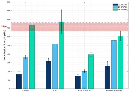 Ice adhesion strength measured on the samples at different relative humidity levels. The red box corresponds to with its standard deviation.
