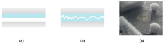 Ice accumulation on equipment exposed to low temperatures can lead to serious issues such as power line failures [], car accidents, and flight delays or crashes []. Various techniques have been developed and implemented to mitigate ice accretion problems. Active methods such as piezoelectric systems [] that generate vibrations to detach accumulated ice help to prevent ice formation, as do electrothermal solutions such as heating pads []; however, these solutions require repeated application, and are both costly and energy-consuming. Therefore, recent advancements in surface technologies have led to the development of icephobic materials. Often inspired by superhydrophobic surfaces, these materials aim to delay freezing and reduce ice adhesion, offering a promising alternative to conventional deicing solutions [,,]. Such surfaces can be achieved through femtosecond laser texturing [], chemical etching [], or indirectly, for instance by texturing injection molds to replicate the desired patterns onto plastic parts [,].