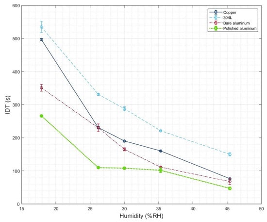 Fu at al. [] investigated the influence of humidity on ice adhesion measurements; however, they did not examine the effect of this parameter on IDT. Therefore, in this study IDT measurements were performed on different samples at room humidity (45.4 ± 0.6% RH), 17.9 ± 0.6% RH, 26.2 ± 0.7% RH, 30.0 ± 0.5% RH, and 35.3 ± 0.6% RH when using the glove box. The evolution of the IDT for each sample as a function of humidity is shown in Figure 8. It can be seen that the 304L stainless steel exhibits a higher IDT at both humidity levels. This observation can be attributed to the low thermal conductivity of 304L steel compared to copper and aluminum, which both have significantly higher thermal conductivity (Table 2).