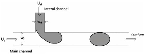 Schematic of the t-junction microchannel. A lateral channel is used for the inlet of the dispersed phase, while the continuous phase flows through the main channel. At the junction, the two phases converge, initiating the droplet formation process. The arrows in the schematic indicate the direction of the flows.