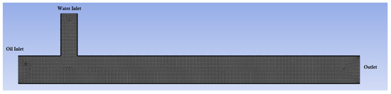 For this study, the CFD software Fluent was employed, which utilizes control-volume-based methods to discretize the governing equations into algebraic forms suitable for numerical solution. The geometry modeling used in the simulations was carried out using Ansys SpaceClaim (2024 R2) software and the mesh generation was carried out afterward, as shown in Figure 2. The quadrilateral mesh was used, providing more accurate calculations of surface tension effects compared to triangular or tetrahedral meshes [44]. The dimensions of the channels can be seen in Figure 3.