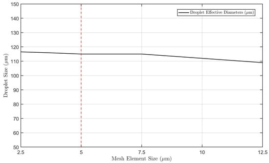 To ensure the adequacy of the number of nodes in the droplets and computational performance, we conducted a study on mesh independence. To this end, we performed a series of simulations with different mesh element sizes, analyzing how the mesh dimensions would alter or influence the droplet size parameters. The mesh independence study aims to identify the mesh element size from which variations in physical parameters (such as droplet size, in this case) become minimized despite further changes in element size. This makes it possible to employ a computational mesh that provides good accuracy while maintaining a reasonable computational cost. Thus, keeping all other variables fixed, we conducted simulations using different mesh element sizes.