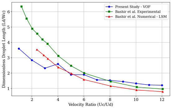 Comparison of droplet length for flow velocity ratios between the present study and the validation model (Bashir et al., 2011 [11]), which includes experimental and numerical data.