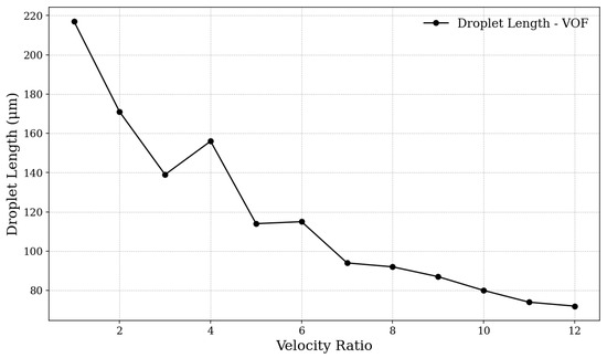 Dimensionless droplet length as a function of the velocity ratio (). A general decreasing trend in droplet size is observed as increases, except near , where an irregular pattern emerges with an unexpected increase in droplet length.