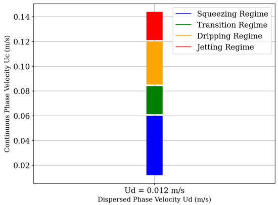 Phase diagram illustrating the different droplet formation regimes as a function of the continuous phase velocity () for a fixed dispersed phase velocity (). The regimes are defined over the following intervals of : squeezing regime (), transition regime (), dripping regime (), and jetting regime ().