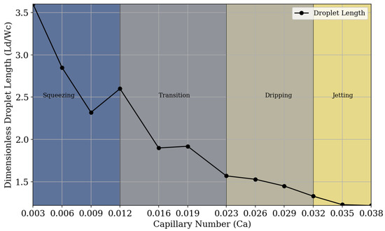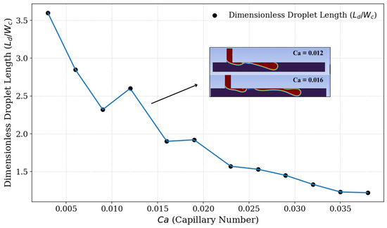 Dimensionless droplet length () as a function of the capillary number (Ca). The results indicate a general decrease in droplet length as the capillary number increases. A slight increase in droplet length is observed around , representing a local deviation from the overall decreasing behavior.