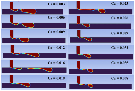 To conduct a more detailed analysis, we identified the moment of breakup that generated the droplet in the main microchannel The visual analysis of droplet breakup and formation enables a classification of the identified regimes according to the associated capillary number. Figure 9 shows the breakup process and the subsequent formation of droplets in the main channel concerning the capillary number () for each of the twelve simulations performed.