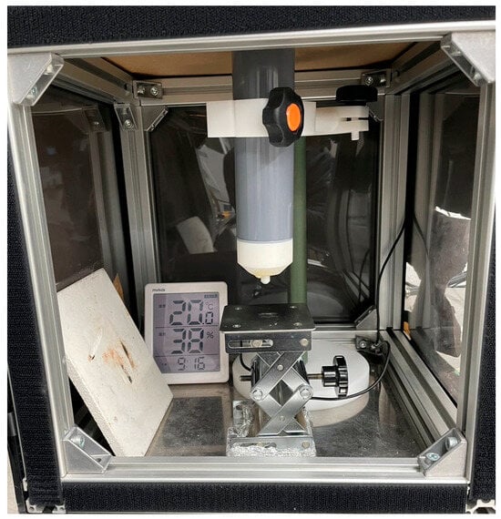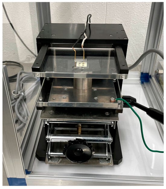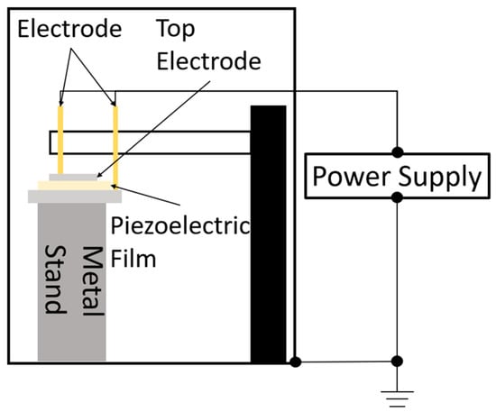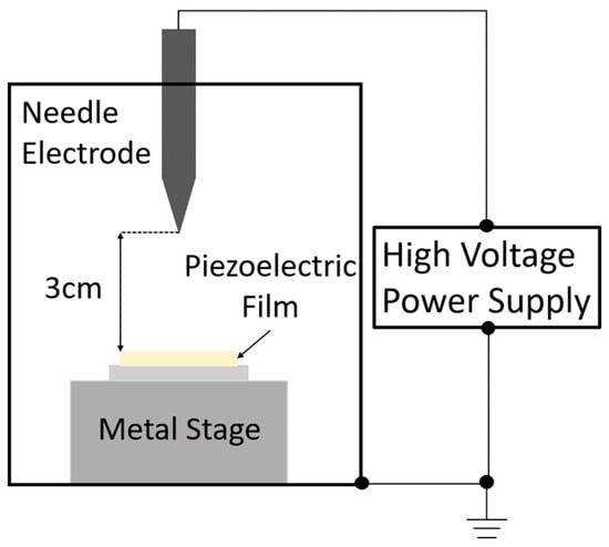The prepared mixture was applied to a titanium substrate (30 mm square, thickness of 3 mm) using an automatic sprayer. Titanium is one of the most common substrates used to prepare sol–gel composites and exhibits excellent heat resistance. Subsequently, the samples were dried at 150 °C for 10 min and sintered at 650 °C for 5 min each. These processes were repeated until the target film thickness (25 μm) was reached. To prevent damage to the top electrode by ozone and other plasma products, corona discharge poling was performed before fabricating the top electrode. The apparatus for corona discharge poling is shown in Figure 1. A schematic representation is presented in Figure 2.