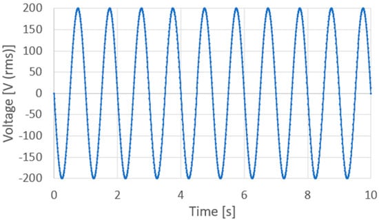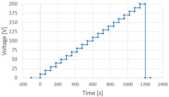 AC and DC voltages were applied using an AC/DC-stabilized power supply (PCR1000WEA, Kikusui Electronics Industry, Kanagawa, Japan). This voltage generated an electric field that was applied to the sol–gel composite via the probes and platinum upper electrode. During AC poling, an AC electric field was applied to control the applied voltage off-phase angle, applied voltage, number of applied cycles, and frequency, controlled via the front panel interface of the KIKUSUI PCR1000WEA system. It should be noted that the voltage off-phase angle refers to the specific phase position (in degrees) within the AC waveform at which the output voltage is turned off. This parameter allows for precise control of the voltage shutoff timing relative to the waveform. Figure 6 shows a voltage application chart where an AC voltage is applied with an applied voltage off-phase angle of 0°, an applied voltage of 200 V (rms), 10 application cycles, and a frequency of 1 Hz. In contrast, during DC polarization, the voltage was increased by 10 V every minute, and 200 V was applied at the end, as shown in the voltage application chart in Figure 7. To suppress dielectric breakdown in the porous sol–gel composite films, the maximum DC field was applied for one minute during the DC poling process.