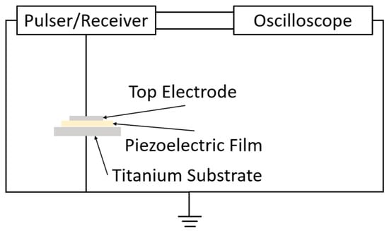 After poling, the piezoelectric constant d33 was measured using a d33 meter (ZJ-3B, Institute of Acoustics, Chinese Academy of Sciences, Beijing, China), and the relative permittivity and dielectric loss were measured using an LCR meter (IM3523, Hioki E.E. Co., Ueda, Japan). The ultrasonic waves were measured using the pulse-echo method with a pulser/receiver (P/R) and an oscilloscope. The experimental system used for ultrasonic measurements is shown in Figure 8.