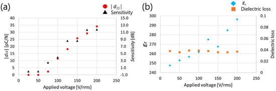 Figure 9 shows the measurement results of d33, ultrasonic sensitivity, relative permittivity, and dielectric loss with increasing applied AC voltage. In Figure 9, when 25 V (rms) and 50 V (rms) were applied, d33 and ultrasonic sensitivity values were 0, indicating that the threshold voltage for poling was not exceeded. Between 75 V (rms) and 200 V (rms), d33, ultrasonic sensitivity, and dielectric constant show increasing trends, indicating that polarization is not saturated even at 200 V (rms). Although the AC poling effect did not reach saturation at 200 V, this limitation is attributed to the maximum output capacity of the current experimental apparatus. As higher AC voltages could not be applied, it remains possible that further enhancement in piezoelectric performance may be achieved using equipment capable of exceeding this voltage threshold. The number of domain walls may have increased, which contributed to the increase in the dielectric constant. It should be noted that in a previous study, d33 and the relative permittivity showed similar trends [22]. Based on the above, the applied voltage was set to 200 V (rms) in this experiment.