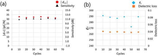 Figure 11 shows the measurement results of d33, ultrasonic sensitivity, relative permittivity, and dielectric loss when polarization was performed by changing the frequency from 1 to 30 Hz. It was found that d33, ultrasonic sensitivity, and dielectric constant showed the highest values when an electrical field of 1 Hz was applied.