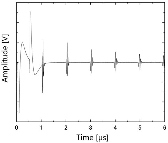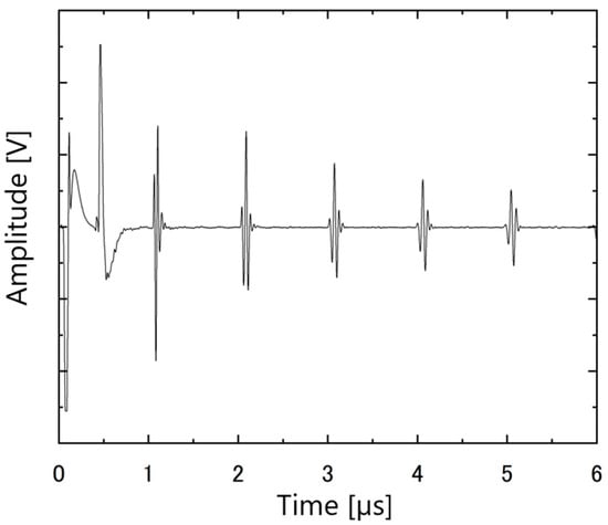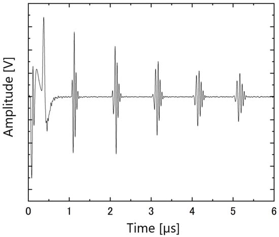 The ultrasonic responses of the PZT/PZT samples with AC poling, the corona discharge technique, and DC poling are shown in Figure 12, Figure 13 and Figure 14, respectively. In each figure, the arrival times of the reflected waves are reasonable based on the calculation of the traveling distance and sound velocity.
