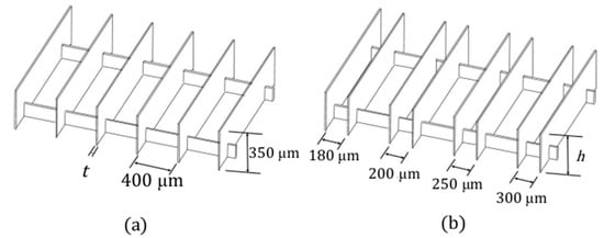To evaluate the printing accuracy and limitations of the current system, thin walls with various thicknesses and heights were test-printed. Two test-print designs were employed, as shown in Figure 2. In Figure 2a, six vertical walls are connected by two horizontal ties that pass through each wall, providing structural support to help them stand upright in a stable manner. The horizontal separation d and height h of the walls were kept constant at 400 μm and 350 μm, respectively, while the wall thickness t varied from 10 μm to 50 μm across different prints. In Figure 2b, four pairs of vertical walls are shown with a constant thickness of 10 μm. The horizontal separations between successive pairs of walls are 180, 200, 250, and 300 μm, respectively. A series of wall heights h, ranging from 100 to 500 μm, were tested in different prints.