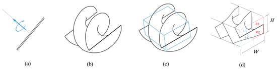 Figure 3. Generation of the Archimedes microscrew model for printing: (a) rectangular generator undergoing simultaneous rotation and translation; (b) resulting screw surface after one full turn; (c) rectangular cuboid section extracted for use; (d) final microscrew with rectangular cross-sectional throughput.