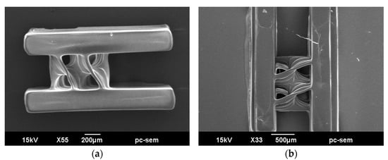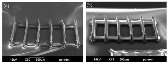 Figure 5 shows scanning electron micrographs (SEMs) of printed structures based on the design in Figure 2a, with wall thicknesses of 10 μm and 20 μm, respectively. In the 10 μm case (Figure 5a), the low stiffness of the thin walls makes them prone to localized buckling, resulting in visible bulging deformation. This phenomenon can be attributed to volumetric contraction associated with polymerization, combined with the layer-by-layer curing process of the current 3D printing technique, which may induce non-uniform residual stress. As the wall thickness increases, its rigidity improves, allowing it to resist buckling more effectively. Consequently, the structure appears nearly normal, and the printed walls become well defined and structurally sound, as shown in Figure 5b.