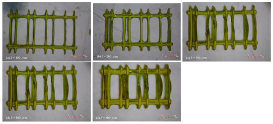 Figure 7 shows the printed results based on the design in Figure 2b, with wall heights (h) ranging from 100 to 500 μm and a fixed wall thickness of 10 μm. In each print, the designed horizontal separations between adjacent wall pairs, from left to right, are 180 μm, 200 μm, 250 μm, and 300 μm, respectively. The actual gap widths are smaller than the designed values due to the wall broadening discussed earlier. At a wall height of 100 μm (Figure 7a), the gaps between each wall pair are generally visible, except near the intersections between the horizontal reinforcing ties and the walls. The excessive curing observed there around the corners can be attributed to previously mentioned factors: the superposition of beyond-the-pixel light, short-range diffusion of free radicals, and accumulation of free radicals from successive exposures. Narrow gaps can confine free radicals, facilitating their accumulation. When the wall height increases to 200 μm (Figure 7b), the spaces in the leftmost 180 μm gap and part of the 200 μm gaps are no longer fully open. Interestingly, the localized bulging observed in Figure 5a does not appear here, likely due to the higher stiffness of shorter walls. Vertical wall profiles remain clearly defined, suggesting that the filling occurs only up to a portion of the wall height. The excess material deep within the gaps may be a residual resin that cannot be completely removed due to surface tension in these narrow intervals. As the wall height increases to 300 μm (Figure 7c) and beyond (Figure 7d,e), the aforementioned issues persist. At a wall height of 500 μm, the entire 200 μm gap becomes filled. Moreover, from a height of 300 μm onward, localized wall bulging begins to appear, indicating that wall stiffness is no longer sufficient to withstand buckling caused by the residual curing stress.