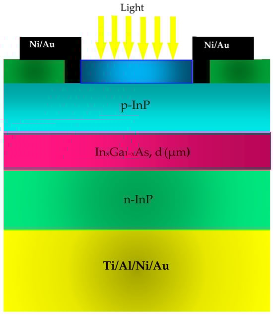 Various studies have thoroughly examined the fr of p-i-n photodiodes [1,2,3,4,5]. The evaluation of the fr for a typical photodiode has been successfully completed [6]. In the linear scenario, a theoretical investigation was conducted that concentrated on the non-linear response case. The influence of space charge effects on the photodiode under conditions of elevated luminosity was successfully achieved [7,8,9,10]. An analytical model was provided to compute the photodiode fr. The fr optimization using two transparent layers implanted on the p-side and n-side of the absorbent area was achieved [1] in order to improve the photodiode response. Authors in [11] have investigated the p-i-n fr composed of a dual depletion region by inserting an intrinsic layer between the active layer and the n+-contact. The temperature can also affect the fr [12]. Finally, ref. [13] developed a mathematical model and compared it with different models in order to show the benefit of using an additional transparent layer instead of using a conventional photodiode. Recent studies show that InGaAs p-i-n photodiodes have become increasingly popular because of their versatile characteristics and extensive applications. These attributes allow for the creation of highly sensitive, ultra-fast, and compact components suitable for various sectors, including high-speed optical telecommunications, medical technology, and advanced electronics and optoelectronics [8,14,15,16,17]. In this work, we explore the fr of a photodiode constructed from InGaAs/InP, analyzing the capacitive effects alongside the global response. The outcome of temperature and indium concentration on the Eg was examined. The effects of strain, absorption surface, and d on the photodiode’s response were thoroughly investigated.