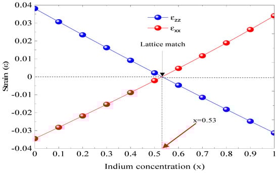 In Figure 2, the concentration x impact on the parallel stress (εxx) and the perpendicular stress (εzz) is depicted. The InGaAs/InP structure contains two strains, one compressive when x is less than 0.53 and the second extensive if x is greater than 0.53. However, InGaAs is the lattice matched to InP, i.e., ε = 0, for an indium concentration of 0.53, which represents the intersection between εxx and εzz; this point represents the robustness of the design (Equations (1) and (2)).