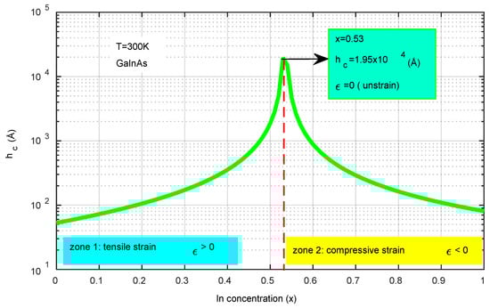 Figure 3 illustrates how the critical thickness (hc) varies with the indium concentration (x). The analysis reveals two distinct regions: zone 1, where x is less than 0.53 and the strain is tensile (ε > 0), and zone 2, where x exceeds 0.53 and the strain is compressive (ε < 0). In both regions, the structure exhibits marginal instability, leading to the formation of dislocations. At x = 0.53, the structure achieves maximum stability with no strain (ε = 0). This research provides insights into the optimal indium concentration necessary to prevent structural dislocation. Consequently, the most stable configuration, characterized by no dislocation, is found at x = 0.53 with hc measuring 1.95 × 104 Å. These simulation findings facilitate the optimization of the dimensions for photodiode layers (Equation (15)).