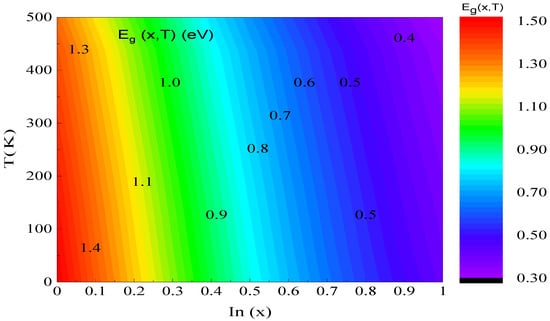 Figure 5 characterizes the evolution of the Eg depending on the x using the Varshni model [14]. We have observed that raising the x and temperature results in a significant decline in Eg. When T = 300 K and x varies from 0 to 1, the Eg changes from 1.41 to 0.36 eV, i.e., it decreases by 1.05 eV. We observe that the x significantly influences the development of the Eg. On the other hand, if we fix the x at 0.53 (unstrained case) and we vary the temperature from 200 to 350 K, the Eg fluctuates from 0.76 to 0.72 eV, i.e., the effect of temperature is small compared to the consequence of the x (Equation (4)). This simulation allows us to seek out an agreement between the temperature and concentration impact to develop the efficiency of the proposed photodiode configuration.